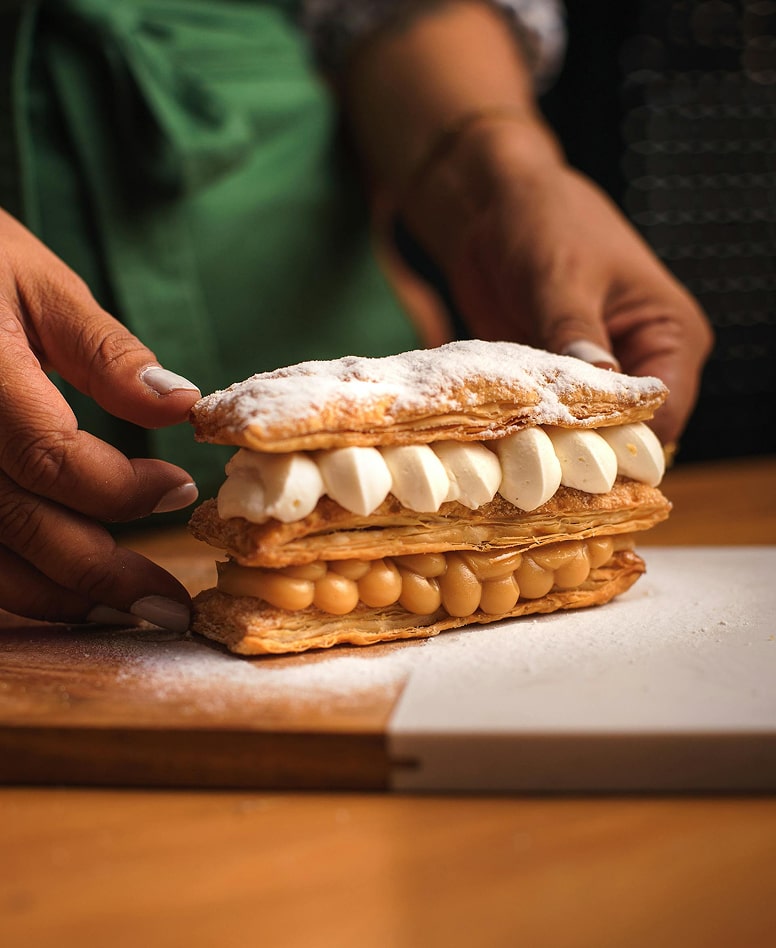 Caramelized pear tart with buttery puff pastry, served warm with crème fraîche and a whisper of vanilla.